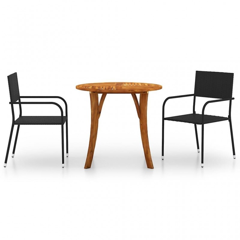 Bord: Material: Massivt oljat akaciaträ Mått: 85 x 75 cm (Diameter x H) Bordsskivans bredd: 2 cm Stol: Färg: Svart Material: Polyrotting, stål Mått: 51 x 60 x 87 cm (B x D x H) Sitsbredd: 48 cm Sitshöjd: 42 cm Kräver montering: Ja Leveransen inkluderar: 1 bord, 2 stolar