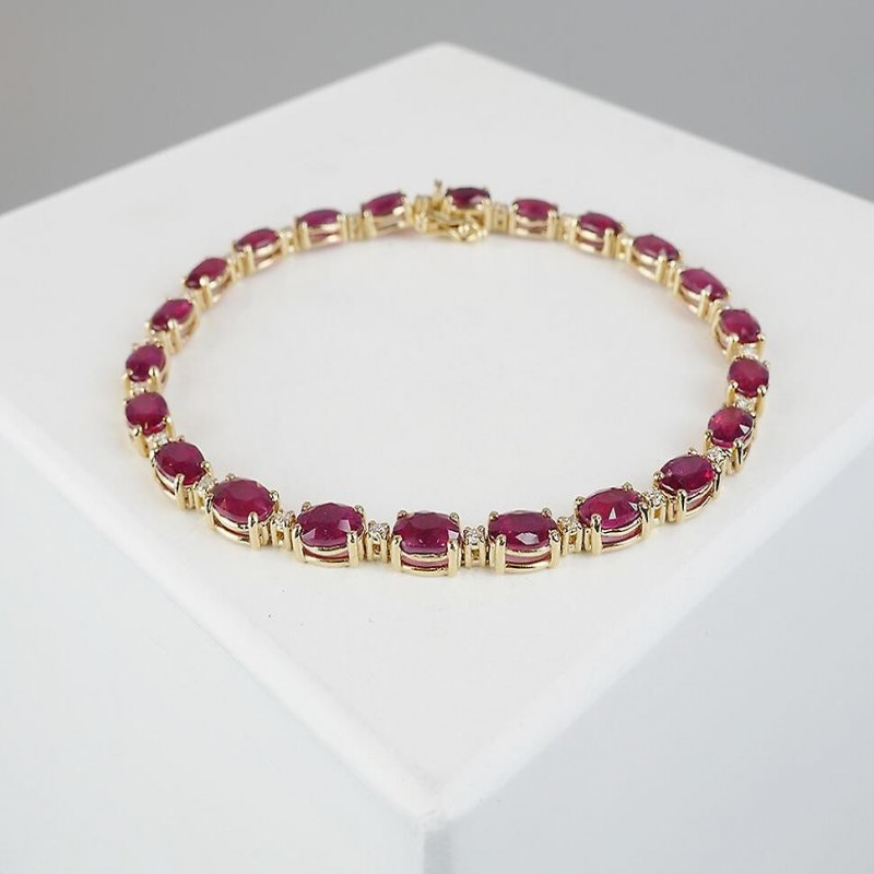 Märke: Christian Material: 14k (585) gult guld Serie: Christian Bracelet Collection Smyckestyp: Armband Ädelstenar: Rubiner och diamanter Rubin: 14,42 ct (naturlig) Färg: Intensiv färg Mått: 6 x 4 mm Diamant: Briljantslipning 0,27 ct Färg: G Klarhet: VSI Längd: 18 cm Bredd: 4 mm Lås: Lådlås (med 2 säkerhetsskåror) Densitet: Solid U-formad Garanti: 2 år För: Damer EAN: 8719878015345 Detta smycke finns inte på plats. Endast tillgängligt online. Förlängning och förkortning möjlig. För mer information, vänligen ring eller maila oss.